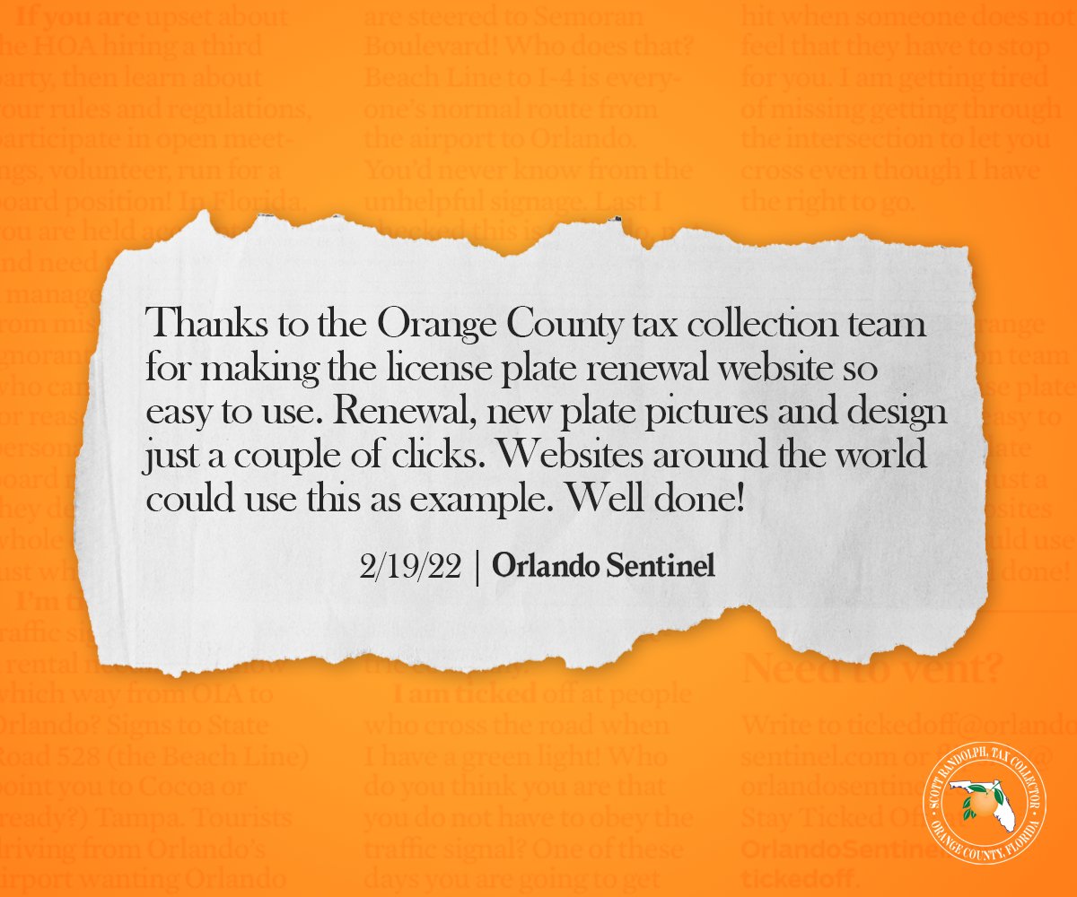 Reviews on Orange County Tax Collector in Sand Lake Rd Orlando FL - Orange County Tax Collector - Sand Lake Orange County Tax Collector Orange County Tax Collector - Lee Vista Orange County Tax Collector Scott Randolph Scott Randolph Orange County Tax Collector Orange County Tax Collector - West Oaks Mall Orange County Tax Collector - Clarcona United. Orlando FL 0 2 282022 This place is the worst. In 2 reviews 8.